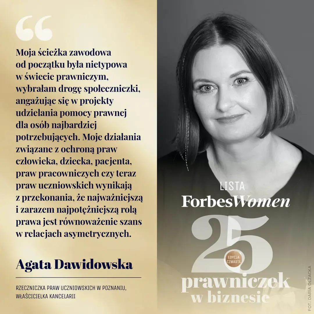 W 2024 roku Forbes Woman wraz z Fundacją Woman In Law uznał mnie za jedną z 25 najlepszych prawniczek w biznesie.